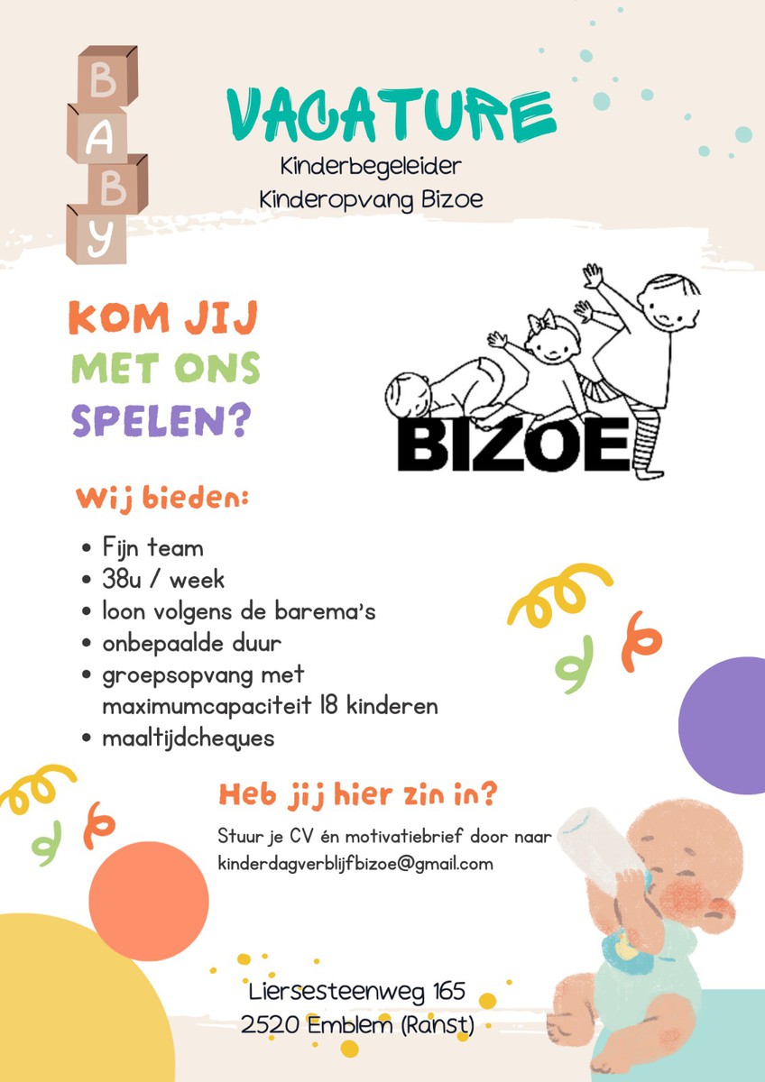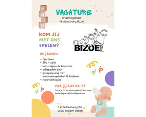 Wanneer kinderdagverblijf Bizoe op zoek is naar aanvulling van kinderbegeleiders kan je de vacatures hierover hier vinden!